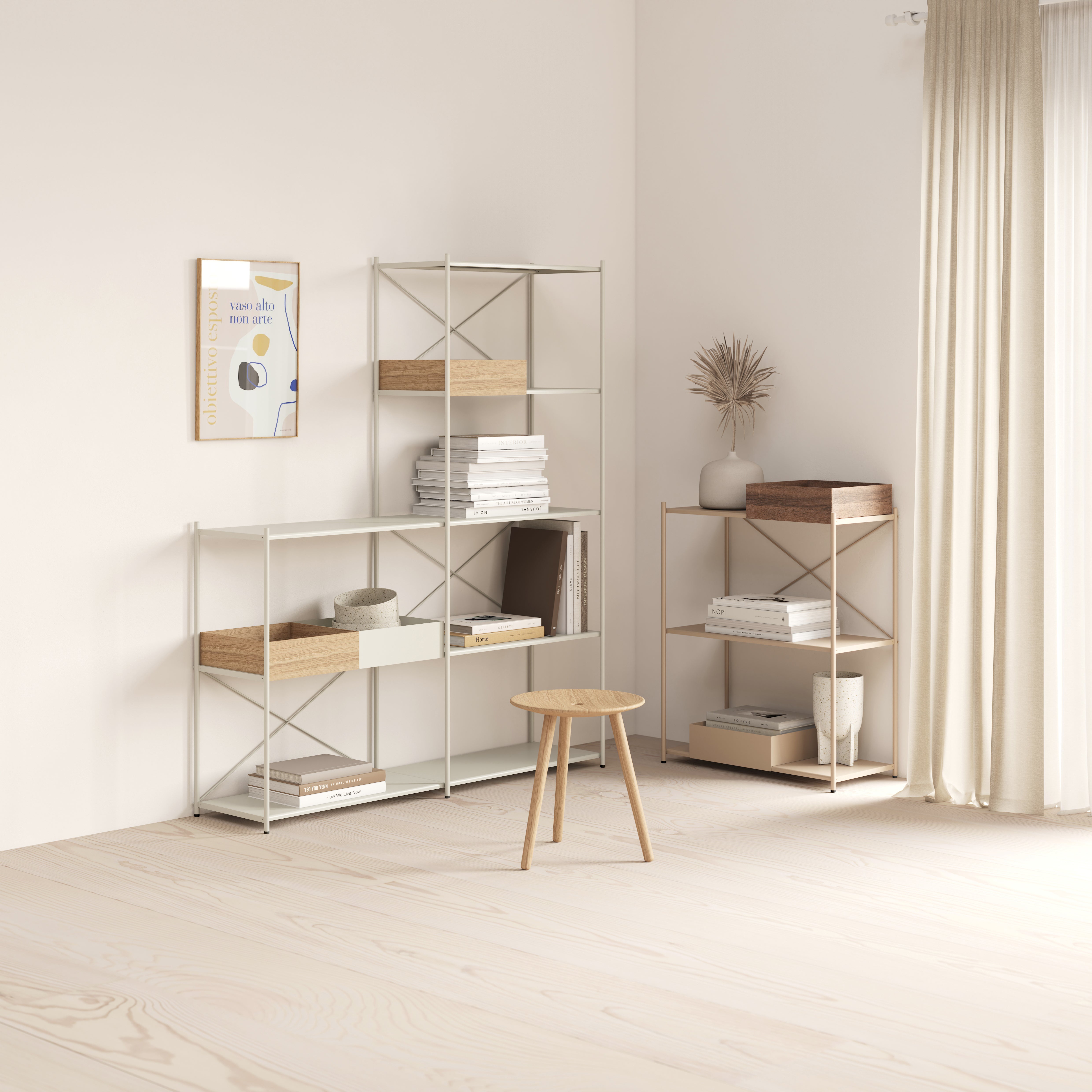 ARTURO er et alsidigt reolsystem fremstillet af pulverlakeret metal i de elegante nuancer Lys grå og Ørkensand.