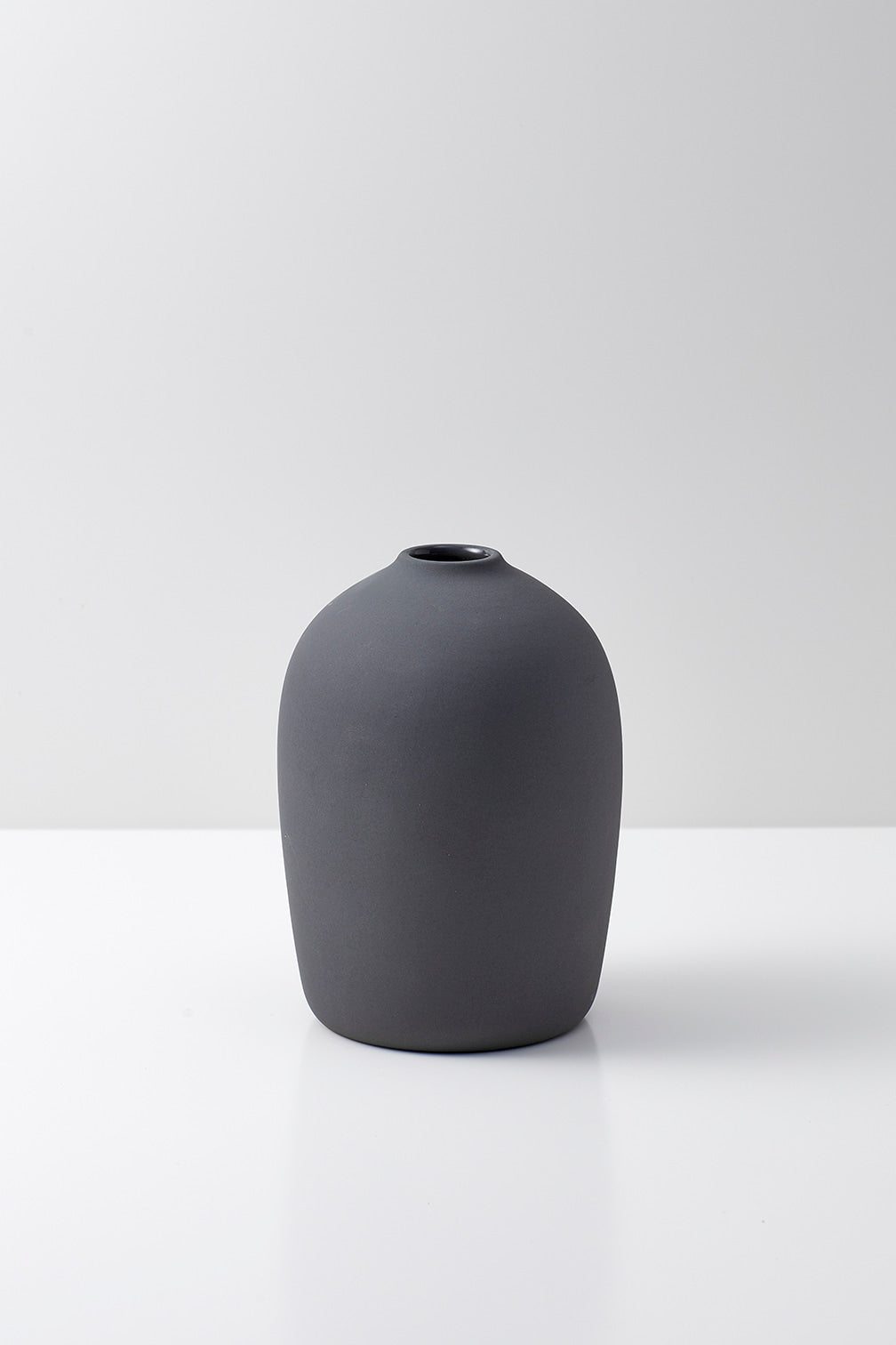 Den cylindriske, organiske silhuet med den lille åbning i toppen, gør vasen ideel til en enkelt blomst, en dekorativ gren eller halm til et moderne look. Overfladen har en fantastisk rå tekstur.