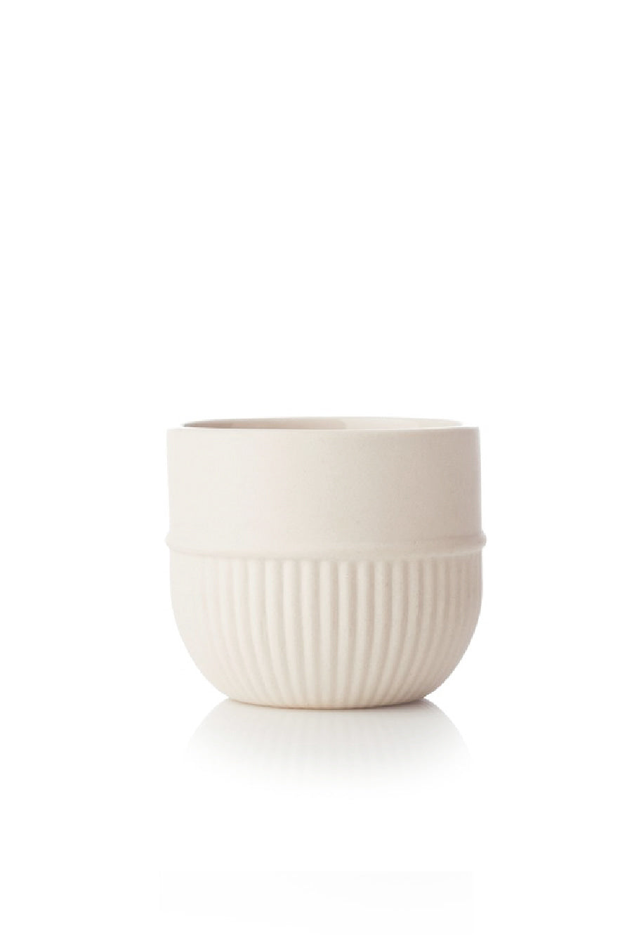 The ROOT cup is made in stoneware with a coarse texture on the outside and a glazed inside. The organic shape fits perfectly in the palm of your hand, and the design, with the grooved bottom, provides the cup with a raw yet elegant look.